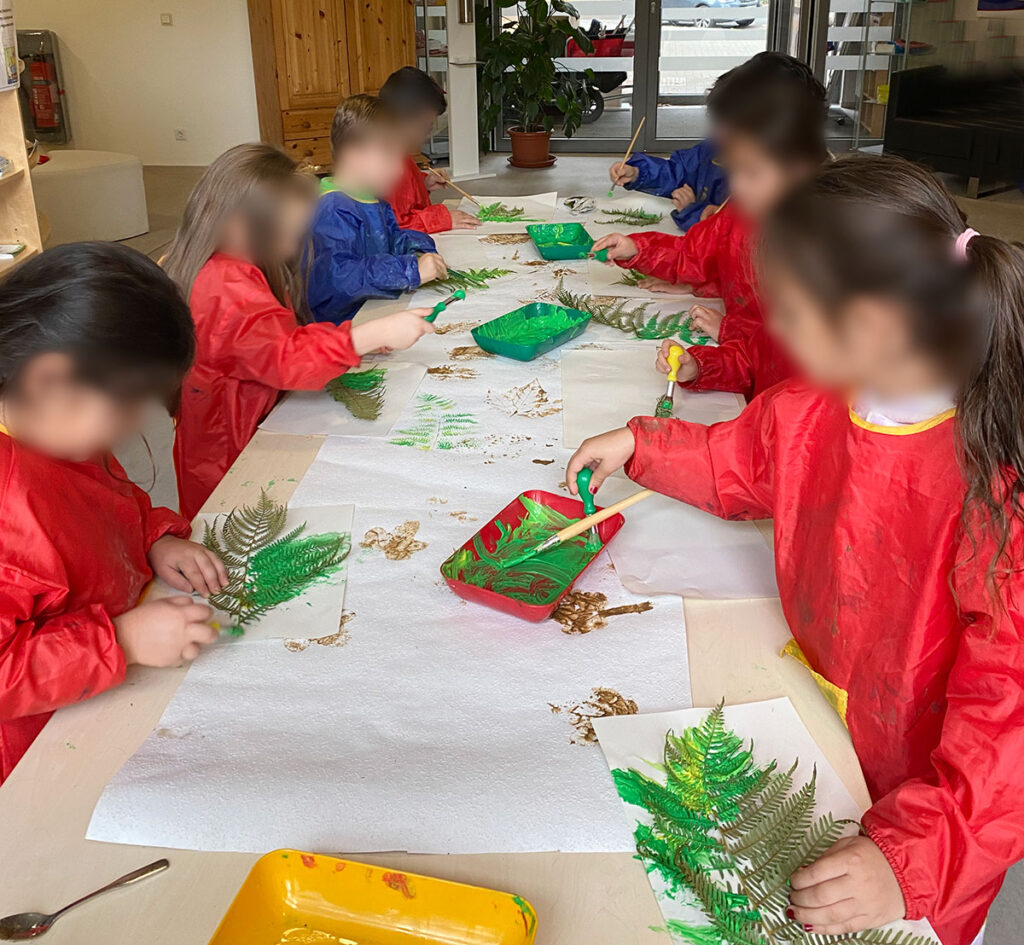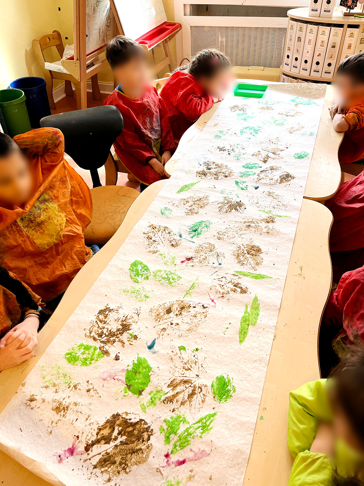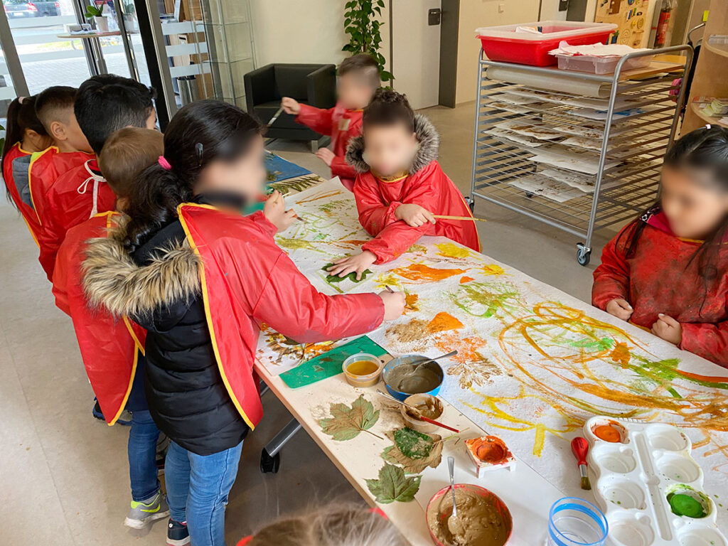 Der Fokus liegt hier auf spielerischer Umweltbildung: Die Natur wird haptisch erlebbar und stärkt durch das gemeinsame Malen das Wir-Gefühl der Gruppe.